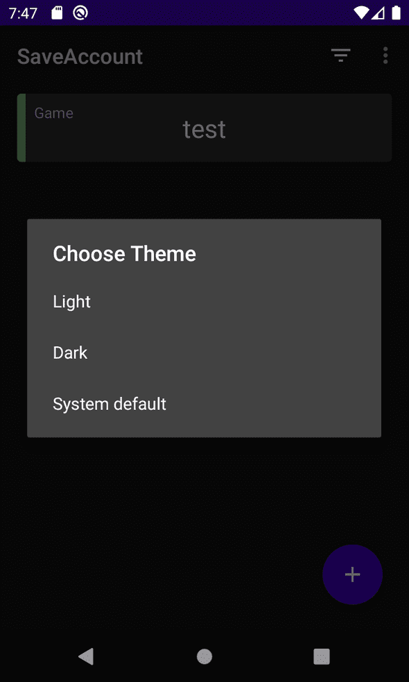@HiltAndroidApp class AccountApplication : Application() { override fun onCreate() { super.onCreate() val sharedPreferences = PreferenceManager.getDefaultSharedPreferences(this) val themePref = sharedPreferences.getString("themePref", ThemeHelper.DEFAULT_MODE) applyTheme(themePref ?: ThemeHelper.DEFAULT_MODE) } }AppCompat.DayNight로 설정한 테마는 아쉽게도 지속성이 없습니다. 따라서 앱 프로세스가 생성될 때마다 테마를 설정해야 합니다. 또 사용자가 설정한 테마를 저장하기 위해 PreferenceManager를 사용해 테마값을 관리합니다 :)