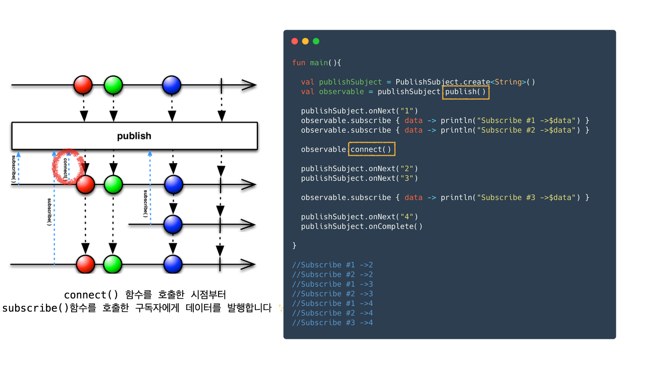ConnectableObservable 클래스는 Observable을 여러 구독자에게 공유할 수 있으므로 원 데이터 하나를 여러 구독자에게 동시에 전달할 때 사용합니다. 특이한 점은 subscribe()함수를 호출해도 아무런 동작이 일어나지 않는다는 점입니다. 왜냐면 새로 추가된 connect() 함수가 호출한 시점부터 subscribe()함수를 호출한 구독자에게 데이터를 발행하기 때문입니다. ConnectableObservable 객체를 생성하기 위해 publish() 함수를 먼저 호출합니다. 후에 여러 구독자들에게 데이터를 발행하기 위해 connect() 함수를 호출합니다. connect() 함수를 호출하기 전까지는 데이터의 발행을 미루는 것입니다. :)