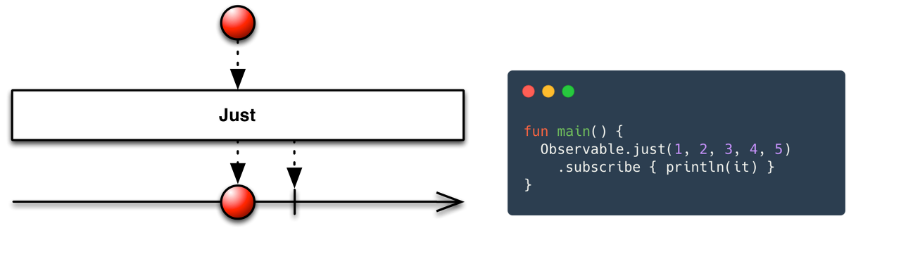 데이터를 가장 쉽게 발행하는 방법으로는 just() 를 사용하면 됩니다. just() 는 최대 10개까지의 데이터를 넣어서 발행할 수 있습니다. 즉 데이터를 넣으면 바로 방출될 수 있다는 말인데요. 그만큼 무거운 연산을 제어하게 될 때는 just() 를 지양하는 것이 좋습니다.