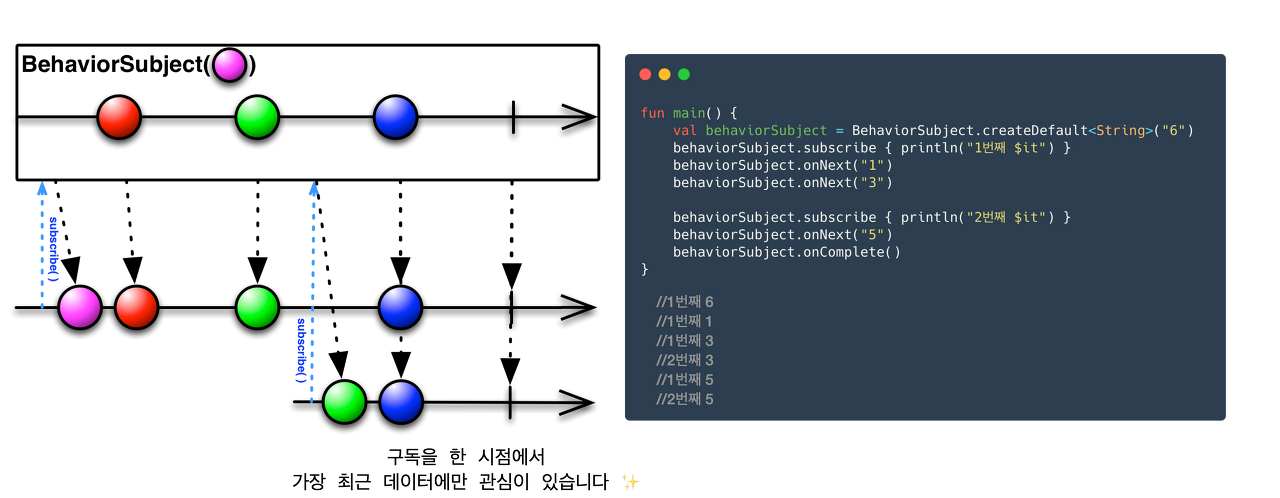 BehaviorSubject 는 구독을 한 시점부터 가장 최근 값을 반환해주는 클래스입니다. 만약에 구독 시점에 최근 값이 없다면 기본값을 넘겨주기 때문에 초기에 default 값을 정해주게 됩니다.