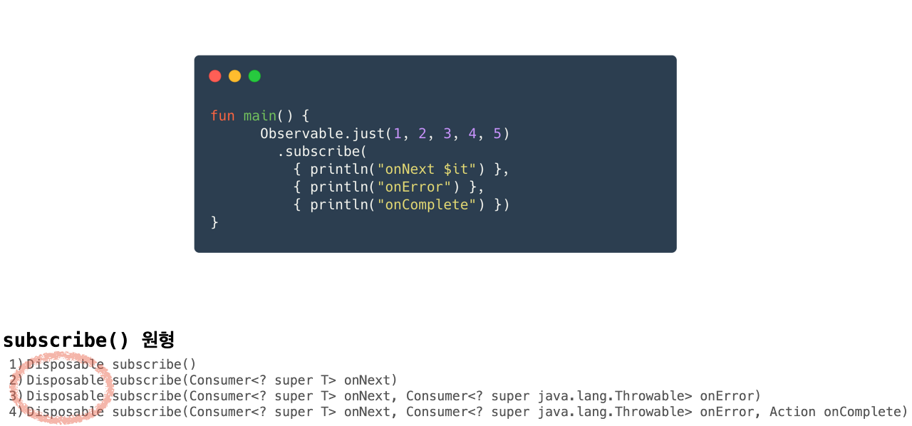 subscribe 는 아래와 같이 4개의 코드 형태를 가지고 있으며 반환형은 모두 Disposable입니다. onNext, onError, onComplete 이벤트가 발생되었을 때 행동을 코드로 적을 수 있습니다.