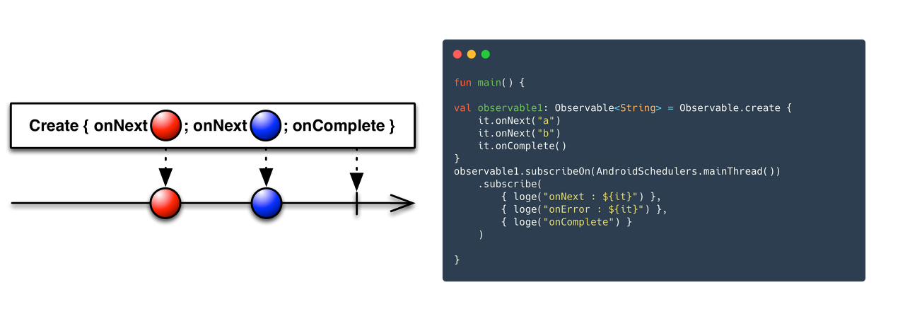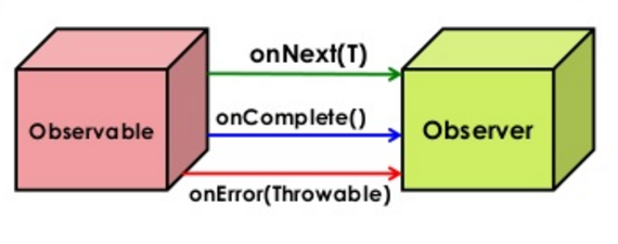 위 그림을 보면 Observable 이 onNext, onComplete, onError 같은 함수를 통해 Observer에게 무언가를 전달하고 있는 것을 볼 수 있습니다. onNext는 데이터를 포장할 때마다 Observer에게 완료된 작업물을 전달하는 것이고 onComplete는 포장 작업이 끝날 때 호출하는 함수, onError는 Observable 내에서 어떤 문제가 생겼을 때 호출되는 함수입니다.