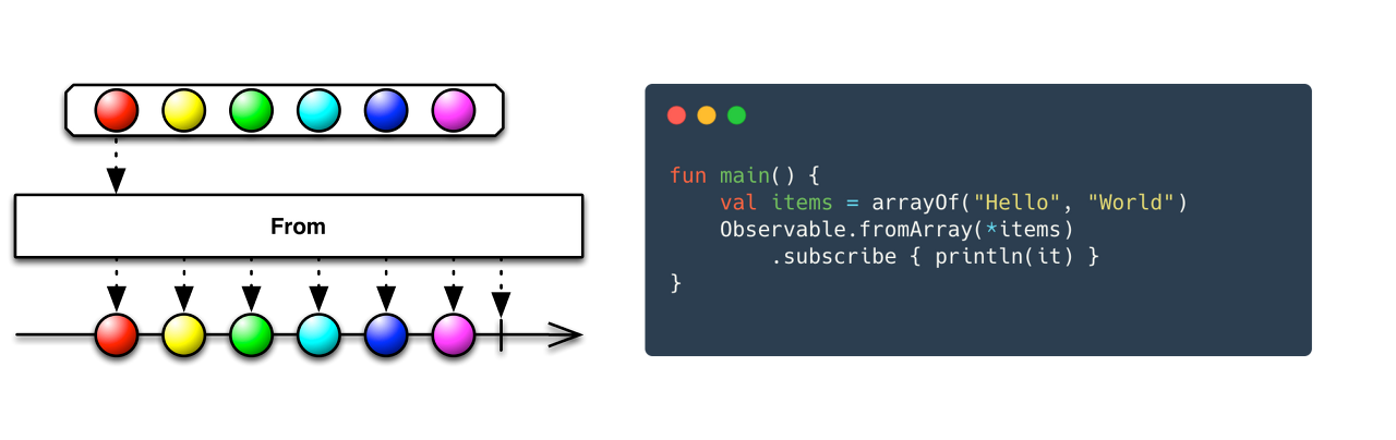Rxjava2 부터 from()함수를 세분화 되었습니다. 이미 참조할수 있는 배열 및 리스트 등의 자료 구조나 future, callable 또는 publisher가 있다면 from으로 시작하는 연산자를 통해 Obserable로 변환이 가능합니다. fromArray, fromIterable 함수는 파리미터로 배열 또는리스트 에 담긴 데이터를 순서대로 생성하는 연산자이고, 모든 데이터를 순차적으로 송신 후 완료됩니다. 반복적인 데이터 변환 작업 같은 경우 for 문 대신 대체할 수 있습니다.