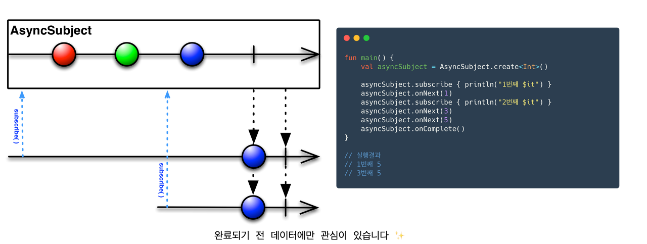 첫번째로 볼 것은 AsyncSubject 입니다. Complete가 되면 가장 마지막 데이터를 받는 형태입니다. 즉, 완료되기 전까지는 구독자에게 데이터를 전달하지 않다가, 완료와 동시에 발행해주고 종료합니다.