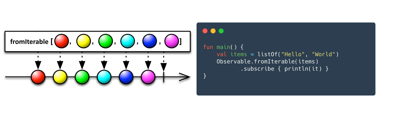 Fromiterable은 iterable 을 implement 한 클래스를 파라미터로 받아 Observable을 만드는 오퍼레이터입니다.