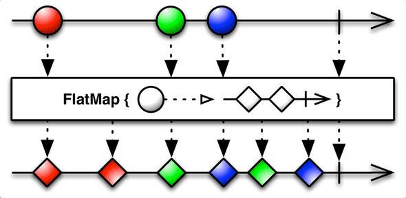 - flatMap() 함수는 원하는 입력값을 어떤 함수에 넣더라도 결과가 Observable로 나오는 일대다 혹은 일대일 Observable 함수