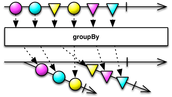 groupBy() 함수는 어떤 기준(keySelector)으로 단일 Observable을 여러 개로 이루어진 Observable 그룹으로 만듭니다.