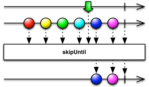 takeUntil() 함수와는 다르게 other Observable에서 화살표가 나올 때까지는 값을 발행하지 않고 건너뛰다가 other Observable에서 값을 발행하는 순간부터 원래 Observable에서 값을 정상적으로 발행하기 시작합니다.