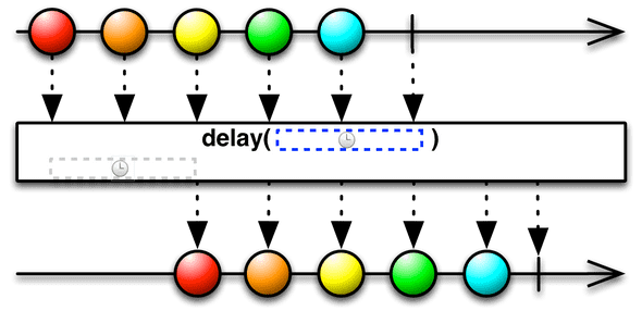 delay() 함수 유틸리티 연산자로 보조 역할을 한다 인자로 전달받는 time과 시간 단위 (ms, m 등) 만큼 입력받은 Observable의 데이터 발행을 지연시켜 주는 역할을 한다.