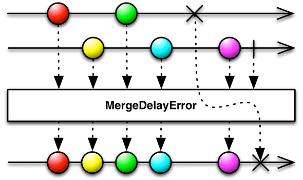 mergeDelayError는 merge와 매우 유사하게 작동합니다. 하지만 병합되는 Observable 중 하나가 onError 알림으로 종료되는 경우에는 다르게 동작합니다. merge 함수일 경우 error가 발생하면 merge 된 Observable이 즉시 onError 알림을 발행하고 종료됩니다. 반면 mergeDelayError는 오류가 발생하지 않는 다른 Observable에게 항목 방출을 완료할 기회를 병합할 때까지 오류보고를 보류하고, 항목 자체를 방출하고 난 다음 종료됩니다. 병합된 다른 모든 Observable이 완료되면 onError 알림니다. 병합 된 Observable 중 두 개 이상에서 오류가 발생할 수 있으므로 mergeDelayError는 onError 알림에서 여러 오류에 대한 정보를 전달할 수 있습니다 (관찰자의 onError 메서드를 두 번 이상 호출하지 않음). 따라서 이러한 오류의 특성을 알고 싶다면 관찰자의 onError 메서드를 작성하여 CompositeException 클래스의 매개 변수를 허용해야 합니다. mergeDelayError에는 Iterable 또는 Observable 배열을 전달할 수는 없지만 Observable을 내보내거나 1 ~ 9 개의 개별 Observable을 매개 변수로 내보내는 Observable을 전달할 수 있습니다. merge에 대한 것이므로 mergeDelayError의 인스턴스 메서드 버전이 없습니다.
