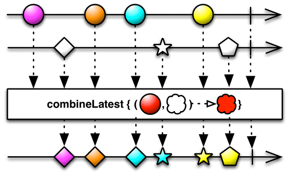 예를 들어 A, B 두 개의 Observeble을 결합한다면 2개의 Observeble에서 모두 데이터를 발행해야 결합할 수 있고 그전까지는 발행을 기다립니다. 마블다이어그램은 다음과 같습니다