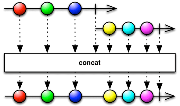 concat() 은 2개 이상의 Observable을 이어 붙여주는 함수입니다. 첫 번째 Observable에 onComplete 이벤트가 발생해야 두 번째 Observable을 구독합니다.