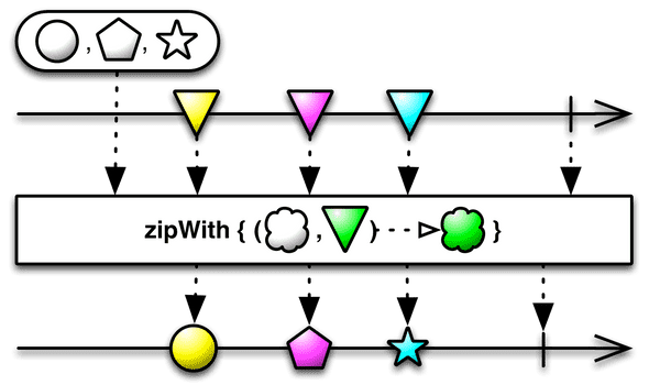 zipWith() zipWith() 함수는 zip() 함수와 동일하지만 Observable을 다양한 함수와 조합하면서 틈틈이 호출할 수 있는 장점이 있습니다.