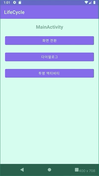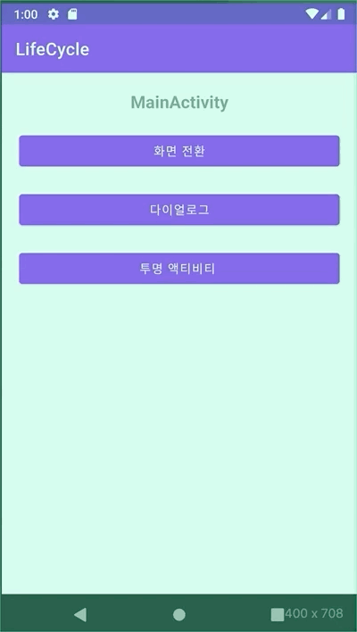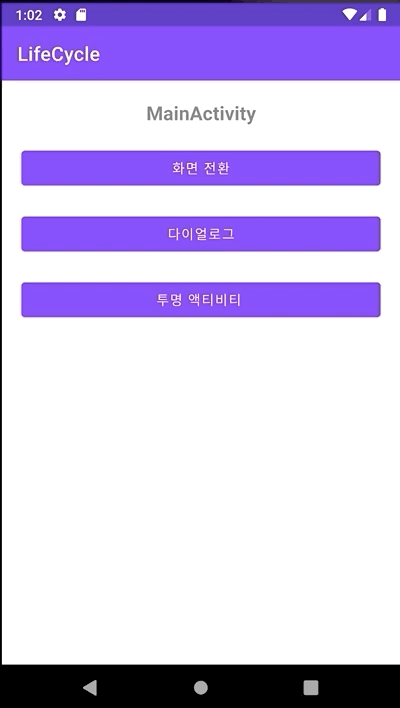 Created: MainActivity Started: MainActivity Resumed: MainActivity //프로세스로 강제 종료할 시 SaveInstanceState가 호출되지 않기 때문에 //데이터를 유지하기 위해서는 AAC ViewModel을 사용해야 한다고 해요!Q.MainActivity가 투명 Acitivity인 TransparentActivity로 호출될 때 발생되는 생명주기