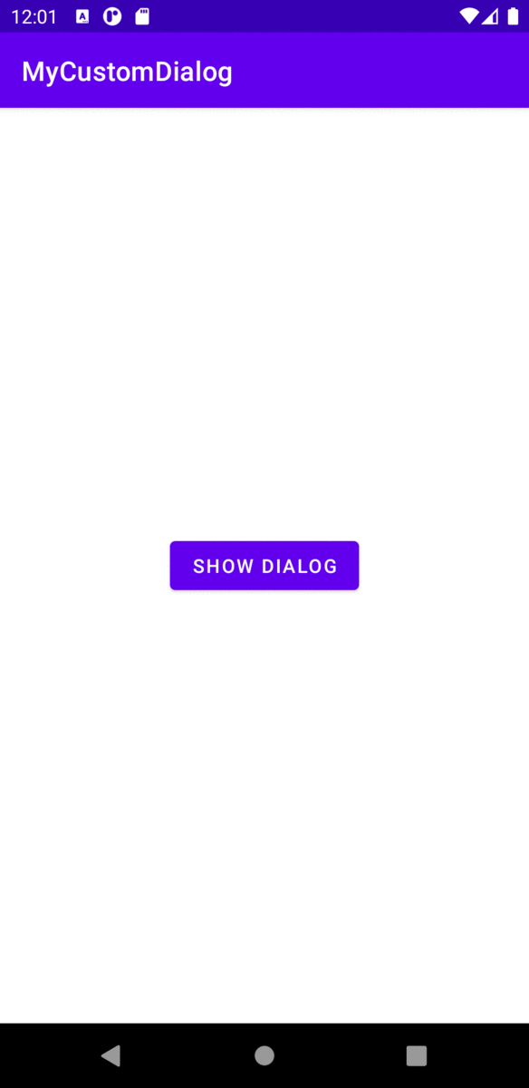 <?xml version="1.0" encoding="utf-8"?> <androidx.constraintlayout.widget.ConstraintLayout xmlns:android="http://schemas.android.com/apk/res/android" xmlns:app="http://schemas.android.com/apk/res-auto" xmlns:tools="http://schemas.android.com/tools" android:layout_width="match_parent" android:layout_height="match_parent" tools:context=".MainActivity"> <Button android:id="@+id/showDialogButton" android:layout_width="wrap_content" android:layout_height="wrap_content" android:text="SHOW DIALOG" app:layout_constraintBottom_toBottomOf="parent" app:layout_constraintLeft_toLeftOf="parent" app:layout_constraintRight_toRightOf="parent" app:layout_constraintTop_toTopOf="parent" tools:ignore="HardcodedText" /> </androidx.constraintlayout.widget.ConstraintLayout>dialog_full_activity.xml 파일을 res/layout 에 생성한 다음 아래 코드를 넣어 준다.