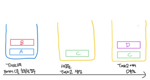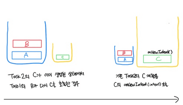오른쪽에 있는 예시는 singleTask로 선언된 액티비티가 먼저 실행되고 그 뒤 Activity2가 실행되는 모습이에요. Activity2에서 1로 돌아갈 때 singleTask로 선언된 Activity1이 현재 작업 중인 태스크 내에 있으므로 onNewIntent가 불려 activity1이 재사용된 다는 것을 봐주세요. 그리고 또 알아둘 것은 singleTask액티비티(Activity1) 위에서 불린 standard 액티비티(Activity2)는 그대로 그 Task위에 생성이 된 다는 점이에요! 위의 예시에서 C에서 D를 불렀을 때 노란색 Task2에 D가 쌓인 것처럼 말이에요!