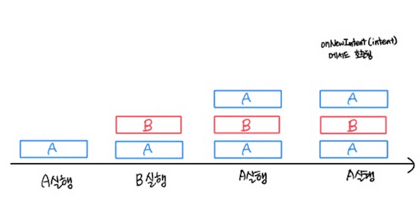 - 태스크에 이미 생성되고 singleTask로 설정된 액티비티가 다시 호출될 경우 onNewIntent() 메서드를 통해 해당 액티비티를 재활용합니다.