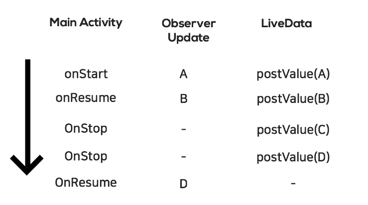 Livedata에 postValue를 A,B,C,D를 해주었지만, onStop일 때 C와 D가 들어갈 경우, 마지막 값인 D만 onResume때 갱신이 됩니다. 이는 onInactive(), 즉 비활성화 상태일 때 값을 업데이트 했기 때문입니다.