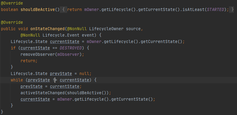 그리고 activeStateChanged() 메소드에서는 위에서 shoudBeActive()에서 현재 Lifecycle의 Owner의 현재 Lifecycle State를 얻어와 그 State가 STARTED, RESUMED인 경우 True, 아닌 경우 False를 리턴해줍니다. True 또는 False 값을 하단의 메소드 activeStateChanged()의 파라미터인 newActive의 값으로 전달해줍니다.