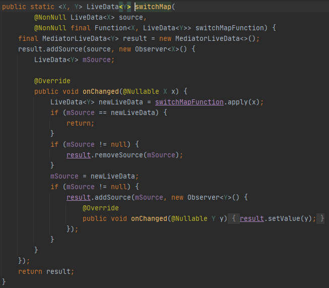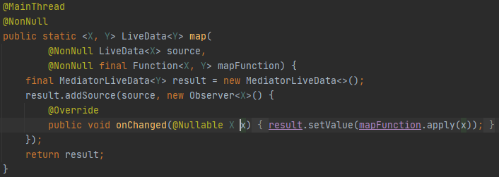 map함수의 구현부입니다! map은 먼저 제네릭 메소드로 만들어졌으며, 리턴 값은 LiveData입니다. 위의 예시로보면, User형의 userLiveData를 첫 인자로 넘겨주고, 결과 값으로 String형의 LiveData를 리턴 받습니다. 파라미터로 LiveData형의 source, 두 번째 파라미터로 함수를 받고 있는데요, 보이는 Function<X,Y>는 X를 받아 Y로 반환해주는 함수입니다. MediatorLiveData로 만든 변수 result가 있으며, result에 addSource를 통해 인자로 받아온 source와 옵저버를 달아줍니다. 후에 source값의 변경이 있을 경우 onChanged() 메소드가 실행되어 result에 setValue를 통해 mapFunction, 즉 파라미터에서 받아온 X를 Y로 변환해주어 result의 값을 바꾸어줍니다. 이해하기 쉽게 말하자면 LiveData X를 LiveData Y로 바꾸어주는, 매핑해주는 함수입니다!