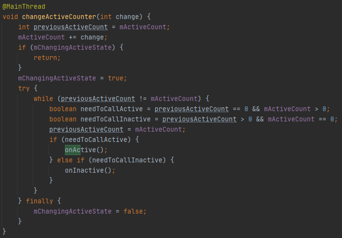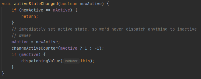 이를 통해 현재 상태와 새로들어운 newActive상태가 같다면, 즉 옵저버의 수가 같다면 즉시 return해주고, 다른 경우 mActive에 newActive값(boolean)을 넣어줍니다. 그리고 changeActiveCounter()에서 mActive값에 True이면 1 , False이면 -1을 넣어줍니다. 이를 통해 옵저버의 개수를 증가 시키거나, 감소시켜줍니다.