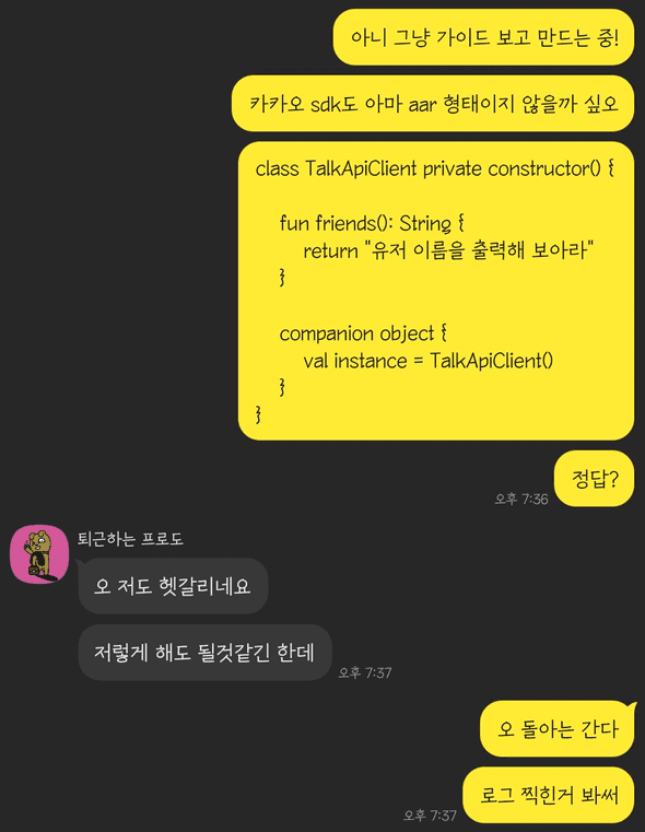 LinkClient.instance.isKakaoLinkAvailable(context) 과 LinkClient.instance.customTemplate(context, templateId) 를 보고 머리를 탁 쳤…지만 코틀린 조무래기 입장에서는 저 형태를 어떻게 만들어내야 할지도 고민이었다. 그 순간 갑자기 매셥 안드팀의 점냥(재료)님이 떠올랐습니다. ^^ (늘 이렇게 고민하는 상황이 되면 누군가를 붙잡고 이야기를 막 쏟아내는데 그러다 보면 답이 나와서 신기하다. 되도 않는 이야기 늘 들어주시는 주변 분들께 감사를 전합니다.)
