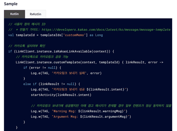 보통 SDK는 aar 형태로 배포하기 때문에 타인의 코드를 참고하는 게 쉽지 않다. 이가 없으면 잇몸이라고, 순간적으로 모두에게 열려 있는 도큐먼트가 떠올랐다. 유레카! 역시 답은 카카오 API 가이드 문서에 있었다.