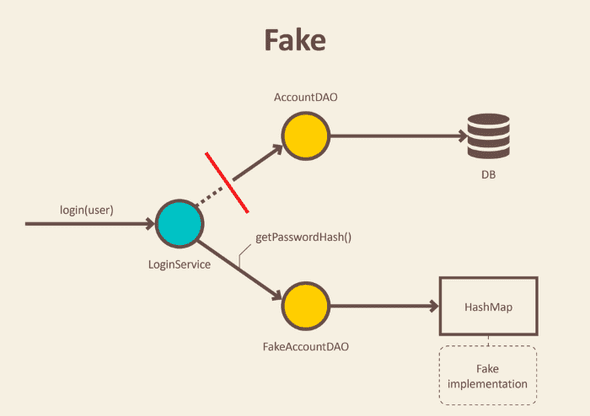 테스트를 진행하기 위한 방법들(Test Doubles) 중 하나인 Fakes는 아래 그림처럼 실제로 사용되는 객체는 아니지만 같은 동작을 하는 구현 객체 입니다.