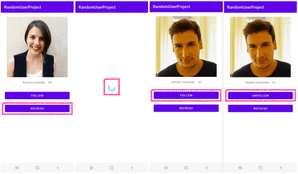 - getRandomUser() : API로부터 랜덤한 인물 한 명을 불러온 후 uiState를 업데이트한다.