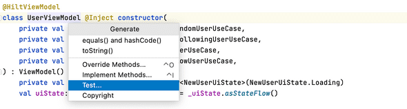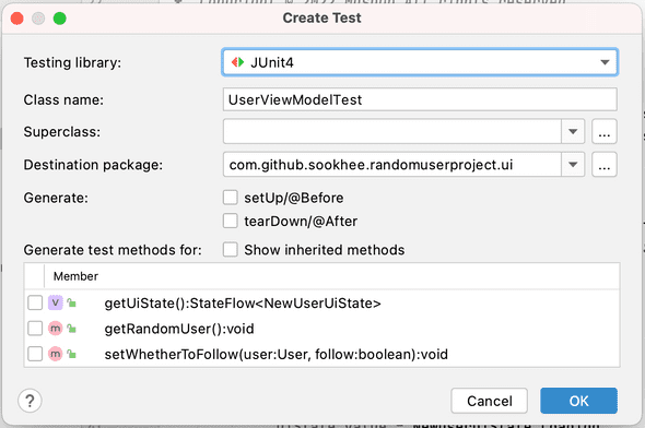 UserViewModel에서 Cmd + N(mac) 또는 Alt + Insert(Window)를 눌러서 “Generate” 창을 연 후 Test 코드를 작성할 파일을 생성해줍니다.