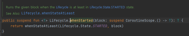 내부의 whenStarted는 아래의 함수로 만들어져있는데, coroutineScope의 block을 LifecycleState가 STARTED일 때 시작, 취소해주는 함수인 것 같네요!