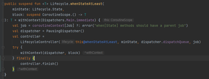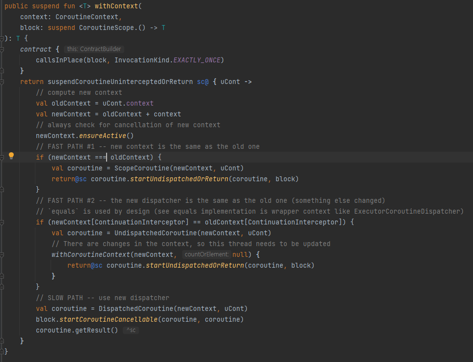 내부에서 dispatcher와 job을 지정해주고, withContext() 메소드를 실행시켜줍니다. withContext() 내부를 보면, 다음과 같습니다.
