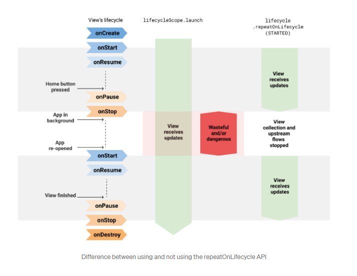 viewLifecycleOwner.lifecycleScope.launch { viewLifecycleOwner.repeatOnLifecycle(Lifecycle.State.STARTED) { viewModel.someDataFlow.collect { // Process item } } }그런데 어느 정도는 알지고 있었지만, 제대로 알지 못해 더 자세하게 알고 싶어서 포스팅하게 됐습니다.