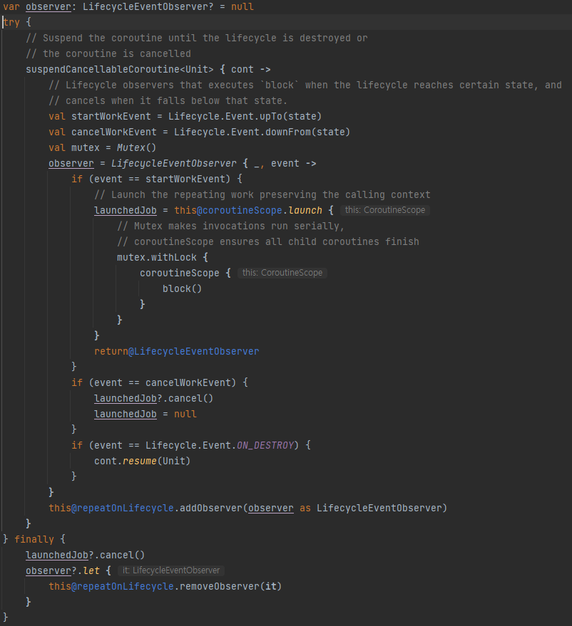 짧게 요약하자면, 옵저버를 만들고, startWorkEvent와 cancelWorkEvent를 생성하여, 옵저버를 통해 해당 Lifecycle에 도달하면, 코루틴 job을 생성하고, 취소하는 작업을 반복합니다. 또한 try finally문으로 try문의 suspendCancellableCoroutine이 끝날 때 job을 cancel해주고, observer를 제거해줍니다.