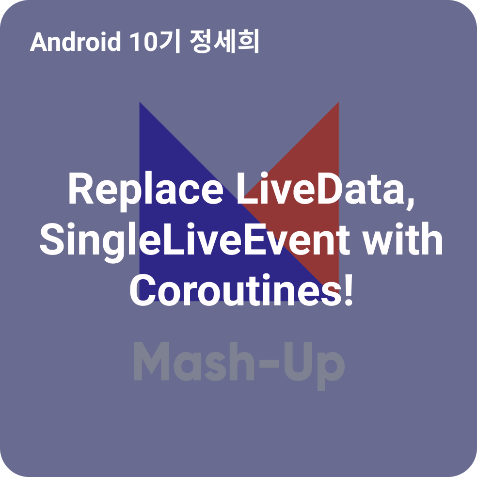 안드로이드에서도 이제 별도의 라이브러리 추가 없이 Coroutine을 기본적으로 사용할 수 있습니다. 비동기 라이브러리의 대표적인 Rxjava를 뒤쫓고 있는 무서운 녀석이죠. 앞서 매쉬업 안드로이드 블로그에서 기본적인 Coroutine 동작방법에 대해서 설명했다면, 이번 글에서는 비동기적으로 사용하는 방법 외에 MVVM 아키텍처에서 자주 쓰이는 LiveData 와 SingleLiveEvent 를 Corouitne의 Flow, Channel 로 대체해서 사용하는 방법에 대해 알아보려고 합니다.