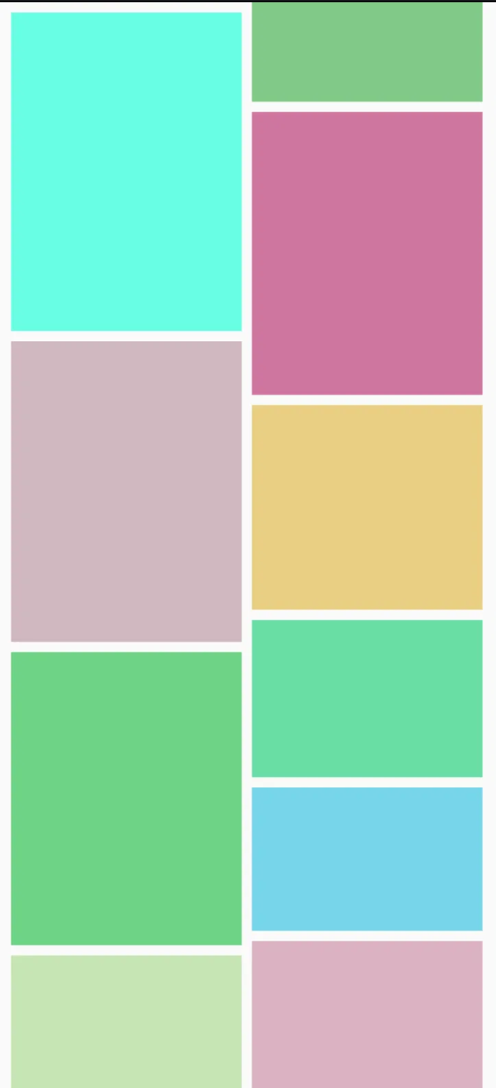 Box(modifier = Modifier.padding(4.dp) .size(width = 160.dp, height = Random.nextInt(100, 250).dp) .background( color = Color( red = Random.nextInt(100, 255), green = Random.nextInt(100, 255), blue = Random.nextInt(100, 255) ) ) )색상과 높이는 랜덤으로 지정하여 각 카드별로 다른 높이를 가질 수 있도록 구성하였습니다. 이제 만들어준 카드들을 각 카드들 높이의 맞추어 배치하는 작업이 필요합니다.