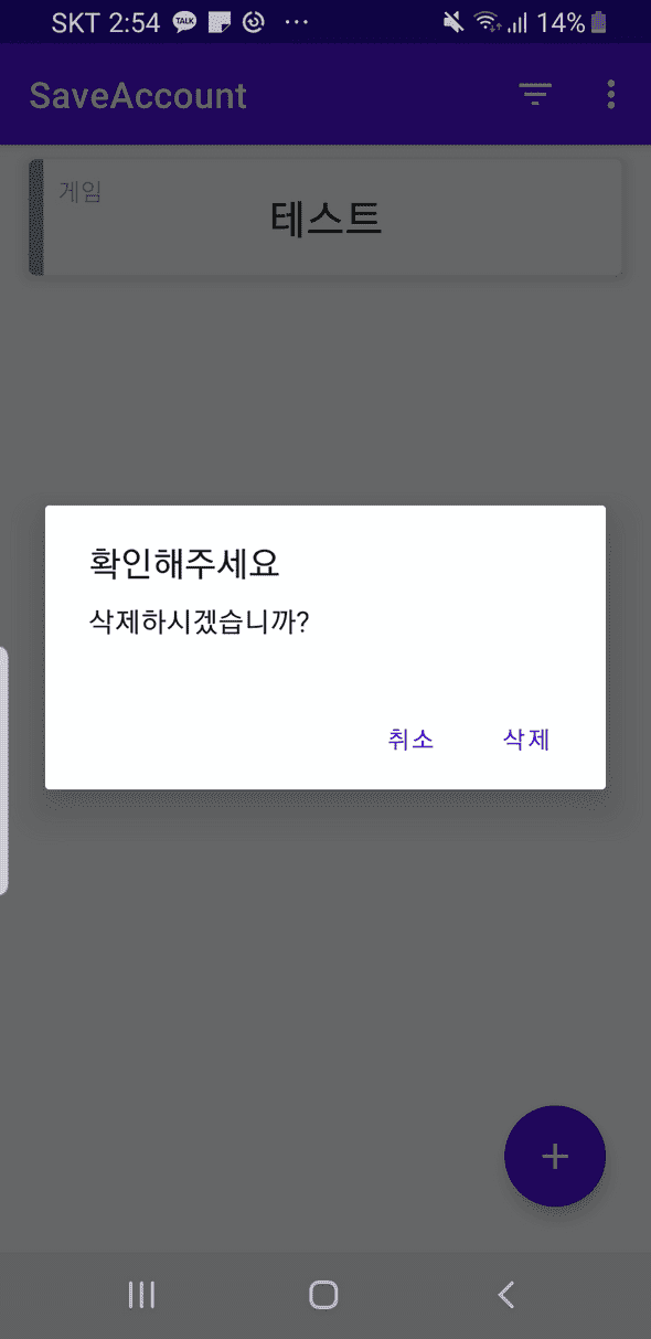 - 1의 기능을 수행한 후, 해당 뷰를 롱 클릭을 하면 보여지는 다이얼로그에서 삭제 버튼을 누르면 리스트에서 해당 계정이 리스트에서 표시 안되는 것을 확인한다.