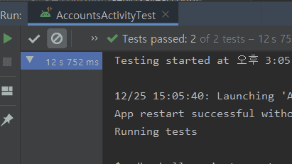 @Test fun createAccount() { ... //이 아래부터는 AddEditAccountActivity가 화면에 표시되고 있다. ... Espresso.pressBack() //이 아래부터는 AccountsActivity가 화면에 표시되고 있다. // isDisplayed로 접근한 뷰가 화면에 표시되고 있으면 성공!, 아니면 실패 onView(withText("testAccount")).check(matches(isDisplayed())) }이제 테스트 케이스의 성공 여부를 판단하는