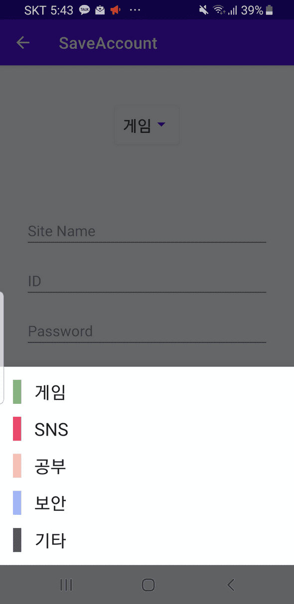 - 계정의 Category, SiteName, UserId, UserPwd를 입력 받으며, 저장 버튼을 누르면 SQLite에 계정이 저장됩니다.