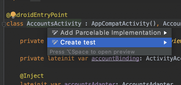 @RunWith(AndroidJUnit4::class) @LargeTest class AccountsActivityTest { @Test fun createAccount() { //ToDo createAccount Test } @Test fun createAccount_deleteAccount() { //ToDo createAccount_deleteAccount Test } }Espresso 는 뷰에 대한 제어만 제공해서 테스트 환경을 구성하기 위해